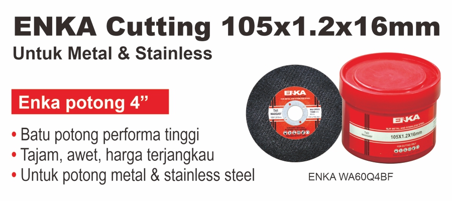 ENKA WA60Q4BF (half label) adalah cutting wheel yang sangat umum dipakai di work shop / bengkel untuk memotong pipa-pipa hollow dan plate STAINLESS. Batu ini memiliki pengaman 2 lapisan fiber net memiliki Max RPM hingga 21000RPM tanpa beban atau Max 15000RPM dengan load ratio 1,4. Memiliki rata-rata rasio potong di atas 2,5 yang menjadikan batu ini tajam dan tahan lama. Tersedia hanya ukuran 4"x1,2 atau 107x1,2x16mm.
